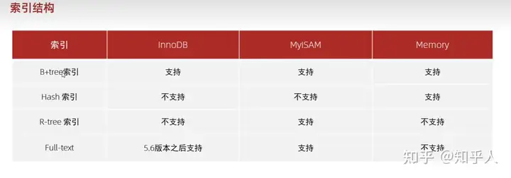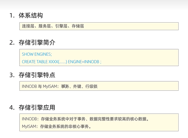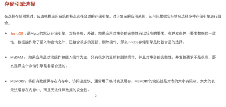 1 | 根据系统应用特点,选择合适的存储引擎,一般用第一个,两外两个现在一般被MongoDB、redis代替 |