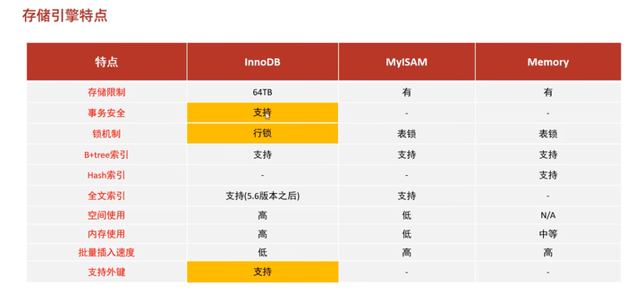 1 | InnoDB:支持事务、行锁、支持外键 |